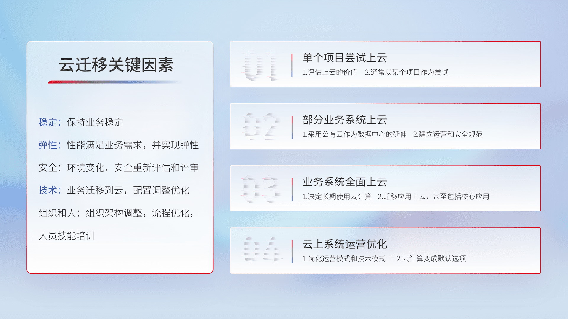 结合实际业务,,,从规划设计、、云平台选型、、、、云原生改造、、数据迁移、、、集成交付,,,迁移全过程为客户识别最佳上云路径,,,,做好风险识别管理,,,,设计网络架构、、、身份权限、、、安全审计合规、、、操作审计、、、、日志审计、、、监控告警策略、、、、多站点容灾设计等,,,,对云上基础设施进行整体规划,,,提升IT治理水平,,以满足弹性、、、高可用、、、、高性能的需求。。。